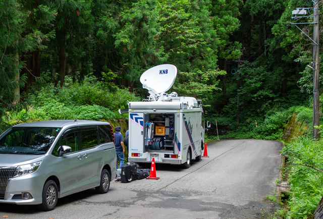 えー、なにやら中継車がお家の前の道に止まっています。