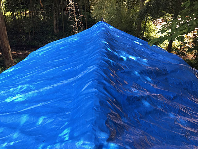 屋根を覆えるように、お庭で畳んで広げて被しました。