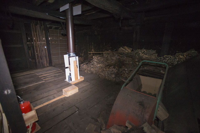 薪保管庫は囲炉裏部屋の上になります。だんだん置かないように減らしていますが、昔は冬になる前に、しっかりと薪を貯めていました。薪ストーブの煙突が抜けています。また、下方放射消火器もこちらにあります。